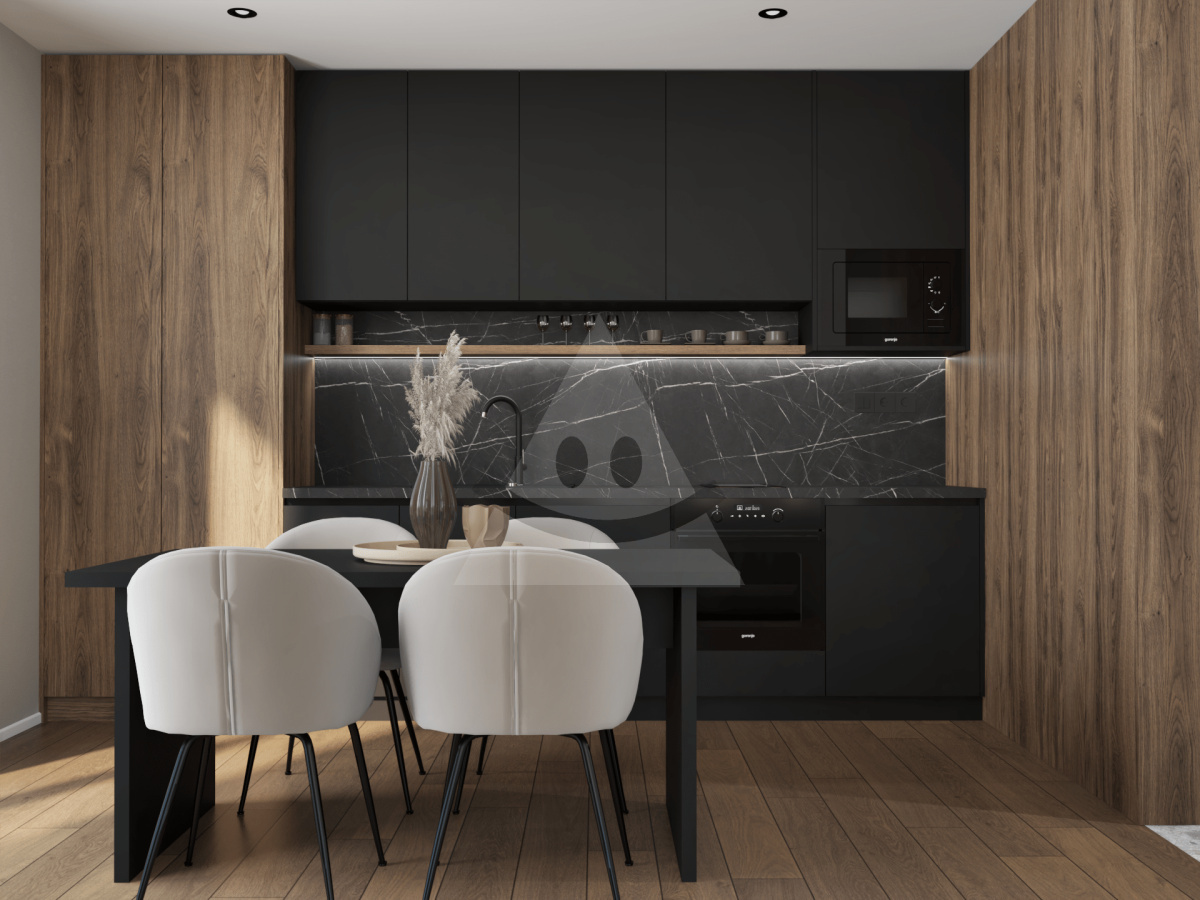 • Kompletná kuchynská linka: S drezom a vstavanými spotrebičmi (chladnička, mikrovlnná rúra, indukčná dvojplatnička), umývačka riadu a vstavaná rúra.